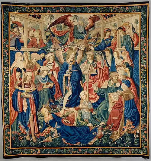 The main weaving centres were ruled by the French and Burgundian branches of the House of Valois, who were extremely important patrons in the Late Medieval period. This began with the four sons of John II of France (d. 1362), whose inventories reveal they owned hundreds of tapestries between them. Almost the only clear survival from these collections, and the most famous tapestry from the 14th century, is the huge Apocalypse Tapestry, a very large set made for Louis I, Duke of Anjou in Paris between 1377 and 1382.[37]