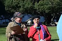 Abbott (right) at the Jack London Oak Tree (background) Dedication in January 2017 at Frank H. Ogawa Plaza