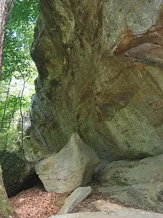 The Tegtmeyer Site is a prehistoric rock art site located north of Piney Creek in Piney Creek Ravine State Natural Area in Randolph County, Illinois. The site consists of two petroglyphs painted on a sandstone rock shelter. One petroglyph depicts a winged anthropomorph in flight, while the other depicts a winged zoomorph which may also be flying. Based on their similarity to other sites from the period, the petroglyphs at the site most likely date from the Mississippian period. The petroglyphs resemble some of the figures painted at the nearby Piney Creek Site; given that the Tegtmeyer Site was unsuitable for inhabitation, it was most likely used for additional paintings which could not fit at the Piney Creek Site.[2]