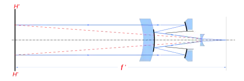 A diagram of light travel through a wide-angle lens showing how focal length can be shorter than the lens.