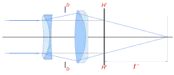 Diagram of a typical telephoto lens with a large positive lens and a smaller negative telephoto group combined to create a much longer focal length - f.