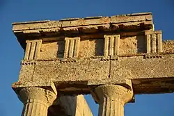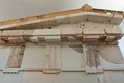 As is the case at the temples of Artemis at Brauron and Aulis (among others), many temples of Artemis have such back rooms, which may indicate a similarity of cult practice.[7] The cella of the temple of Aphaia had the unusual feature of having two rows of two columns supporting another level of columns that reached the roof. The architrave of this temple was constructed in two courses, giving it a height of 1.19 m versus the frieze height of 0.815 m; this proportion is unusual among temples of the region, but is known from temples in Sicily. A triglyph and metope frieze is also placed along the inside of the pronaos.[8] These metopes were apparently undecorated with sculpture, and there is no evidence of pedimental sculpture. This temple and much of the sanctuary was destroyed by fire around 510 BC.