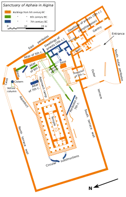 Aphaia (Greek Ἀφαία) was a Greek goddess who was worshipped exclusively at this sanctuary. The extant temple of c. 500 BC was built over the remains of an earlier temple of c. 570 BC, which was destroyed by fire c. 510 BC. Elements of this older temple were buried in the infill for the larger, flat terrace of the later temple, and are thus well preserved. Abundant traces of paint remain on many of these buried fragments. There may have been another temple in the 7th century BC, also located on the same site, but it is thought to have been much smaller and simpler in terms of both plan and execution. Significant quantities of Late Bronze Age figurines have been discovered at the site, including proportionally large numbers of female figurines (kourotrophoi), indicating – perhaps – that cult activity at the site was continuous from the 14th century BC, suggesting a Minoan connection for the cult.[2] The last temple is of an unusual plan and is also significant for its pedimental sculptures, which are thought to illustrate the change from Archaic to Early Classical technique. These sculptures are on display in the Glyptothek of Munich, with a number of fragments located in the museums at Aegina and on the site itself.[3]