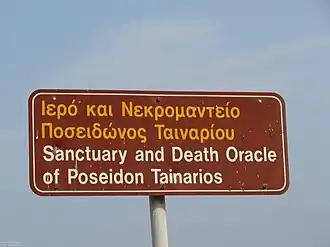 Strabo described the sanctuary as a sacred grove with a nearby cave. The geographer Pausanias wrote of a cave-like temple with a statue to Poseidon at its entrance. In antiquity, the cave was thought to be the entrance to Hades. When Sparta was devastated by an earthquake in 464 BC, it was said that the cause had been Poseidon's vengeance on the Spartan ephors after they had killed helots who had taken refuge at the sanctuary. It is thought that the sanctuary at Tainaron dates at least to a time when the helots were still independent, before they had been subjugated by the Spartans.[2][3]