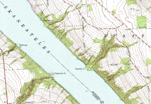 Ten Mile Point (Tenmile Point[1]) is a scenic area on the shore of Skaneateles Lake, New York, a popular picnic spot for lake outings in the late 19th and early 20th centuries.[2][3][4][5] It is located at the mouth of a ravine[6] on alluvium.[7] Onondaga County Road 72 runs through it and is locally known as "10 Mile Point Road".[8] It was formerly the property of the Skaneateles Railroad and Steamboat Company (Skaneateles Park Company) who built a steamboat dock, a dancing pavilion and planted a grove of trees there.[6][9] Their planned hotel[6] was never built.[10] And in 1906 Ten Mile Point was purchased by the Auburn and Syracuse Electric Railroad Company from the Skaneateles Park Company.[11] It is now the location of Lourdes Camp, an historic facility of the local Roman Catholic diocese. In 1990 the "Six Town Picnic'" that had been held annually from 1885 until World War II was revived at Ten Mile Point.[2]