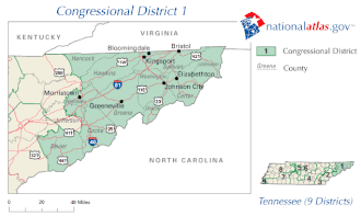 Cities and towns represented within the district include Blountville, Bristol, Church Hill, Elizabethton, Erwin, Gatlinburg, Greeneville, Johnson City, Jonesborough, Kingsport, Morristown, Mountain City, Newport, Pigeon Forge, Roan Mountain, Rogersville, Sneedville, Sevierville, and Tusculum. The 1st district's seat in the U.S. House of Representatives has been held by Republicans since 1881.