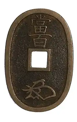 The Tenpō Tsūhō (Japanese: 天保通宝; kyūjitai: 天保通寳 or 天保通寶) was an Edo period coin with a face value of 100 mon, originally cast in the 6th year of the Tenpō era (1835).[4][5] The obverse of the coin reads "Tenpō" (天保) a reference to the era this coin was designed in, and "Tsūhō" (通寳) which means "circulating treasure" or currency.[6] The Kaō is that of Gotō San'emon,[7] a member of the Kinza mint's Gotō family (後藤家), descendants of Gotō Shozaburo Mitsutsugu, a metalworker and engraver from Kyoto appointed by shōgun Tokugawa Ieyasu in 1600 to oversee the Edo mint of his shogunate and oversee its coinage.[8][9][10] All mother coins were produced in Edo (present day Tokyo) before they were sent to other mints where they would place the individual mint's mark (shirushi, 印) on the edge of the coin. The coin circulated for 40 years, and stopped being produced during the Meiji Restoration after the introduction of the Japanese yen. Today these coins are now sold as "lucky charms" as well as being collected by numismatists.