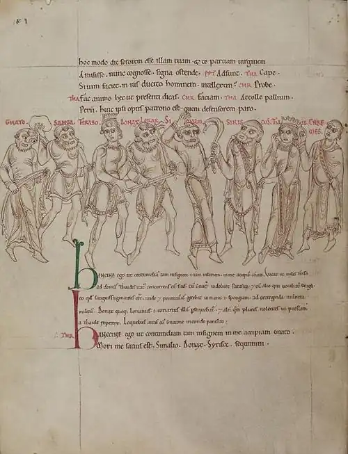 Approximately 650 manuscripts exist of later date.[74] These are often known as the "Calliopian" manuscripts, based on subscriptions to the plays found in several of the earlier manuscripts indicating the text had been corrected by someone named Calliopius; nothing further is known of this individual.[75] They date from the 9th century onwards and are written in minuscule letters. This group can be subdivided into three classes. The first class, known as γ (gamma), dates to the 9th, 10th, and 11th centuries and includes manuscripts P (Parisinus), C (Vaticanus), and possibly F (Ambrosianus), and E (Riccardianus) among others. They have the plays in the order An., Eu., Hau., Ad., Hec., Ph.. Manuscript C is the famous Codex Vaticanus Latinus 3868, which has illustrations which seem to be copied from originals dating in style to the mid-third century.
