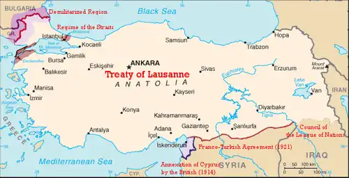 - ^ Treaty of Peace with Turkey signed at Lausanne, Lausanne, Switzerland, July 24, 1923, retrieved November 28, 2012
