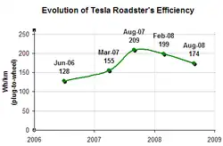 According to the U.S. EPA, the Roadster can travel 244 miles (393 km) on a single charge of its lithium-ion battery pack.[15] The vehicle can accelerate from 0 to 60 mph (0 to 97 km/h) in 3.7 or 3.9 seconds depending on the model. It has a top speed of 125 mph (201 km/h). The Roadster's efficiency, as of September 2008, was reported as 120 miles per gallon gasoline equivalent (28 kW⋅h/100 mi) (2.0 L/100 km). It uses 21.7 kWh/100 mi (135 Wh/km) battery-to-wheel, and has an efficiency of 88% on average.[16]