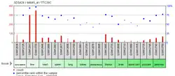 The promoter region controlling expression of transcript variant 1 begins approximately 952 bases upstream of the start codon, and includes the entire 5' UTR.[19] Several possible transcription factor binding sites have been identified using the program El Dorado including the CCCTC binding factor and a site for CTCF, an insulator protein that binds CCCTC.[19] This transcription factor is associated with a number of functions including organization of chromatin.[20] There were also several sites that appear to be the general transcription factor TFIIB, and both E2F and E2F transcription factor binding sites.[19] The E2F transcription factors are involved in mediating the cell cycle, which could be a potential link to the hypothesized role of TTC39C in anaphase.[21] Several microarray studies of humans, dogs and mice have provided evidence that TTC39C is most highly expressed in the liver.[18][22][23] It exhibits relatively high expression in all tissues, and had a percentile rank above 50% in all tissues except in kidney, spinal cord, and skeletal muscle samples of humans.[18]