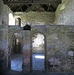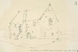 The rectangular Blue Lias stone building has a stone tiled roof. It is 12.4 metres (41 ft) long and 6.6 metres (22 ft) wide.[3] The ground floor had three rooms, one larger than the others which had a fireplace, and a door in the southern wall.[3] The larger room was the hall and linked by arched doorways to the smaller rooms.[21] There were two rooms on the first floor, which were damaged in the fire of 1884, which also has a small entrance door which was accessed via exterior stone steps which no longer exist. There was also a latrine in a turret which no longer exists.[21] There are small traceried arched windows.[2]