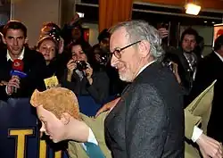 An official announcement about the collaboration was made in May 2007, although both filmmakers had to wait to film it: Spielberg was preparing Indiana Jones and the Kingdom of the Crystal Skull while Jackson was planning The Lovely Bones.[27] Spielberg had considered two books to become the main story, The Crab with the Golden Claws and The Secret of the Unicorn, with the main plot eventually following the latter and its immediate sequel, Red Rackham's Treasure. Jackson felt the former's story "wasn't really robust enough to sustain a feature film", but the filmmakers still included elements from the comic, such as the Karaboudjan and the first meeting of Tintin and Haddock. Spielberg invited Edgar Wright to write the script for the film, but Wright was busy and instead recommended other names, including Steven Moffat.[32] In October 2007, Moffat joined as the screenwriter for two of the Tintin films.[33] Moffat said he was "love bombed" by Spielberg into accepting the offer to write the films, with the director promising to shield him from studio interference with his writing.[34] Moffat finished one draft, but not another due to the 2007–08 Writers Guild of America strike. He then became executive producer of Doctor Who, and was allowed to leave by Spielberg and Jackson.[35] Wright then returned and agreed to take over the script alongside Joe Cornish, a fan of Tintin with whom Wright was working at the time. After two drafts of the script, Wright left to begin filming Scott Pilgrim vs. the World., while Cornish stayed on to finish the script under the guidance of Spielberg and Jackson.[32]