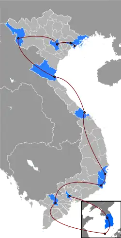 3. ^ Miko Lan Trinh & Hoàng Nam initially arrived in 7th, but they had lost their Detour clue and could not check in without issuing a 30-minute penalty. Trang Khiếu & An Đinh, who checked in after them in last place, had found their clue. They were given the option of returning the clue to Miko Lan Trinh & Hoàng Nam, but doing so would eliminate them. Trang Khiếu & An Đinh chose not to return the clue and settled for the 7th-place finish, resulting in Miko Lan Trinh & Hoàng Nam's elimination.