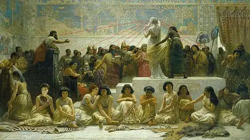 The Babylonian Marriage Market is an 1875 painting by the British painter Edwin Long. It depicts a scene from Herodotus' Histories of young women being auctioned into marriage in the area then known as Babylon or Assyria. It received attention for its provocative depiction of women. Long's use of historical detail to make the painting engaging yet relatable has been highly regarded.[1] The work was purchased by Thomas Holloway in 1882 and is owned by Royal Holloway, University of London.