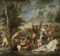 The three canvases of Titian were admired and copied as much in Italy as in Spain by artists like Pieter Paul Rubens, Guido Reni, Nicolas Poussin, and Diego Velázquez, and they contributed to the development of the Baroque style. Rubens' copies of The Bacchanal are housed at the Nationalmuseum in Stockholm.[1] The Italian artist Domenichino famously wept upon hearing that the masterpieces had left Italy.[5]: 70