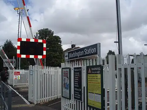 The railway line between Brighton and Portsmouth was built in stages, and the section between Chichester and Havant was opened on 15 March 1847, and there were two intermediate stations, at Bosham and Emsworth.[2] Other stations were opened later, several coinciding with the introduction of steam rail-motor services between Portsmouth and Chichester by the London, Brighton and South Coast Railway on 11 June 1906.[3] One such station, named Denville Halt, was opened on 1 November 1907;[4] the following month this was renamed Warblington Halt.[5] On 5 May 1969 it was simplified to Warblington.[6]