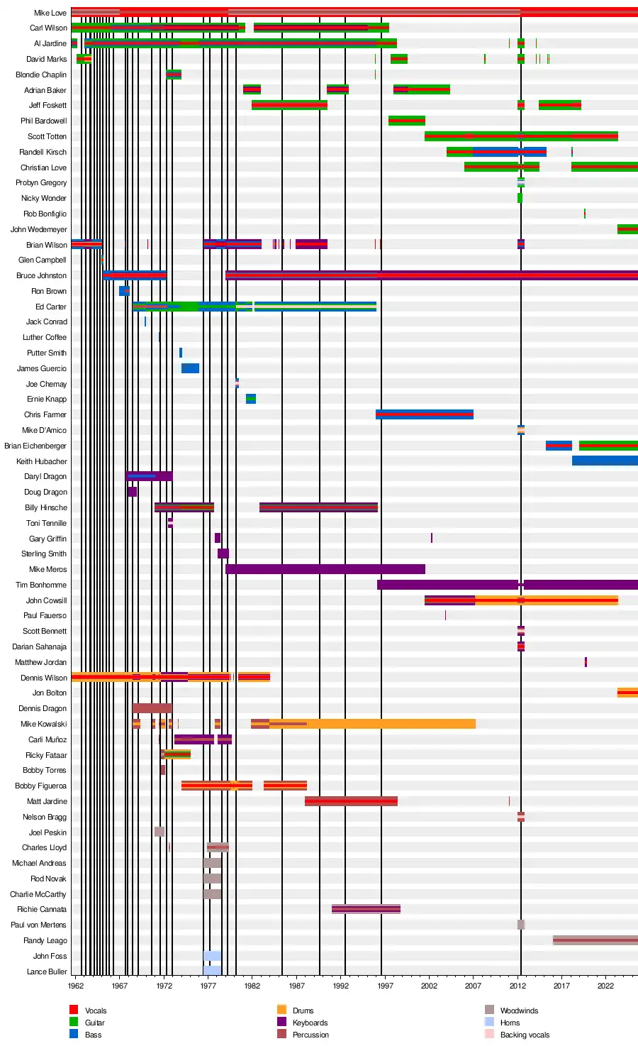 The Beach Boys are an American rock band formed in Hawthorne, California, in 1961. Since then, the band has undergone many variations in composition, with representation by fill-ins onstage. As of 2025, the only principal members included in the Beach Boys' touring band are co-founder Mike Love and 1965 addition Bruce Johnston.