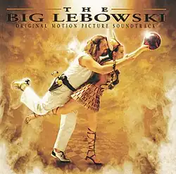 The original score was composed by Carter Burwell, a veteran of all the Coen Brothers' films. While the Coens were writing the screenplay they had Kenny Rogers' "Just Dropped In (To See What Condition My Condition Was In)", the Gipsy Kings' cover of "Hotel California", and several Creedence Clearwater Revival songs in mind.[1] They asked T Bone Burnett (who would later work with the Coens on O Brother, Where Art Thou? and Inside Llewyn Davis) to pick songs for the soundtrack of the film.[2] They knew that they wanted different genres of music from different times but, as Joel remembers, "T Bone even came up with some far-out Henry Mancini and Yma Sumac.[3] Burnett was able to secure songs by Kenny Rogers and the Gipsy Kings and also added tracks by Captain Beefheart, Moondog and Bob Dylan's "The Man in Me".[1] However, he had a tough time securing the rights to Townes Van Zandt's cover of the Rolling Stones' "Dead Flowers", which plays over the film's closing credits. Former Stones manager Allen Klein owned the rights to the song and wanted $150,000 for it. Burnett convinced Klein to watch an early cut of the film and remembers, "It got to the part where the Dude says, 'I hate the fuckin' Eagles, man!' Klein stands up and says, 'That's it, you can have the song!' That was beautiful."[1][4][5] Burnett was going to be credited on the film as "Music Supervisor", but asked his credit to be "Music Archivist" because he "hated the notion of being a supervisor; I wouldn't want anyone to think of me as management".[3]