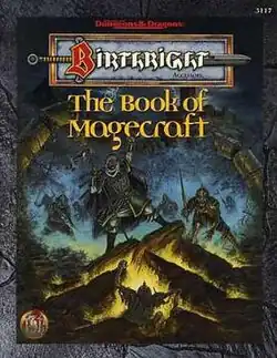 The Book of Magecraft covers the magic using classes of the Birthright setting: the magician class which specializes in divination and illusion magic and can only cast low-level spells of other types, and the wizard class for which a character must be blooded but is otherwise like the standard mage class.[1] The book also deals with War Magic, a type of spellcasting particular to Birthright which uses War Cards to participate in large battles; the book presents rules on how to create War Magic versions of ordinary spells.[1] The book also presents Realm Magic, which a regent wizard can collect from sources where the magical energy of the land of Cerilia accumulates in pockets.[1] The Book of Magecraft also covers rules for discovering, utilizing, and borrowing source created by regent wizards and ley lines, which a wizard can create and maintain to tap energy from sources.[1] The book details the magician character class, and provides character kits for the class.[1] Additionally, the book includes a selection of Realm, Battle, and standard spells intended to be used for the Birthright, and also describes the Royal College of Sorcery, a list of magic items and artifacts specific to the setting, and details about a group of legendary creatures who are believed to give boons to wizards.[1]