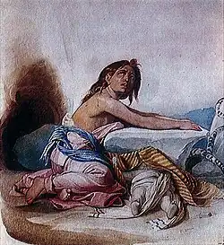 In the right foreground of the painting, a woman rushes towards her husband in fear and despair. The woman's face bears a resemblance to that of Angelica, Bruni's wife. Such an introduction of the artist's native image into the painting can be seen as a manifestation of romanticism in history painting. This woman is the local centre of the right-hand side of the painting: everyone around her is also gripped by terror. The fact that many people seek protection from their relatives and friends does not quite fit in with the biblical description, according to which it was enough to look at a bronze snake to heal people.[16]