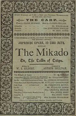The Carp is a one-act comic opera (styled "a whimsicality") with a libretto by Frank Desprez and music by Alfred Cellier. It was first produced at the Savoy Theatre from 13 February 1886[1] to 19 January 1887, as a companion piece to The Mikado. It was then revived as companion to Ruddigore from 21 February 1887 to 5 November 1887. The piece also toured throughout 1888.[2]