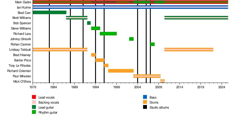 Choirboys formed in the Northern Beaches area of Sydney as a hard rock pub band in 1979.[1] Original members were Brad Carr on lead guitar, Mark Gable on vocals, Ian Hulme on bass guitar and Lindsay Tebbutt on drums.[2]