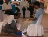 Church members follow the ordinance of feet washing (John 13:5) four times a year as a demonstration of personal humility. The church believes that this is a very important ordinance, citing Jesus' statement to Peter: "If I wash thee not, thou hast no part with me."[24] Church members greet each other with a "holy kiss", preferably on the cheek, to signify that they are greeting each other in the love of God, in accordance with the description given in the King James Version of the New Testament.[17][24] Members of the church believe in the gifts of the Spirit, as described in their scriptures. These include but are not limited to: the word of wisdom, the word of knowledge, faith, healing, prophecy, discernment, witnessing of angels, speaking in tongues, and the interpretation of divers tongues.[17][24]