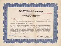 Since 1919, Coca-Cola has been a publicly traded company.[67] Its stock is listed on the New York Stock Exchange under the ticker symbol "KO".[68] One share of stock purchased in 1919 for $40, with all dividends reinvested, would have been worth $9.8 million in 2012, a 10.7% annual increase adjusted for inflation.[69] A predecessor bank of SunTrust received $100,000 for underwriting Coca-Cola's 1919 public offering; the bank sold that stock for over $2 billion in 2012.[70] In 1987, Coca-Cola once again became one of the 30 stocks which makes up the Dow Jones Industrial Average, which is commonly referenced as a proxy for stock market performance; it had previously been a Dow stock from 1932 to 1935.[71] Coca-Cola has paid a dividend since 1920 and, as of 2019, had increased it each year for 57 years straight.[72][73][74][75]