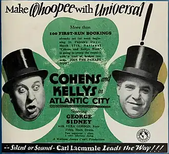 The Cohens and the Kellys in Atlantic City is a 1929 American sound part-talkie comedy film directed by William James Craft and starring George Sidney, Vera Gordon and Mack Swain. In addition to sequences with audible dialogue or talking sequences, the film features a synchronized musical score and sound effects along with English intertitles. The soundtrack was recorded using the Western Electric sound-on-film system. The film is the third entry in the series which began with The Cohens and Kellys, inspired by a play by Aaron Hoffman.[1] Location shooting took place in Atlantic City. Originally shot as a synchronized film without dialogue, some talking sequences were later added at Universal Studios.[2]