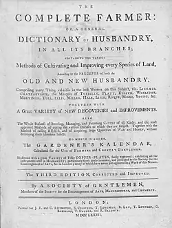 The Complete Farmer: Or, a General Dictionary of Husbandry is an 18th-century English-language encyclopaedia, holding a summary of information on agriculture and in all its branches. It was written by members of the Royal Society of Arts under the pseudonym a Society of Gentlemen, and first issued in 1756[2] and published in weekly numbers until 1768.[3]