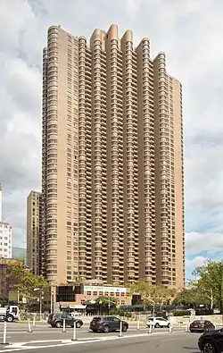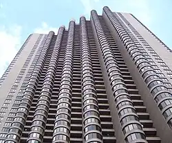 The Corinthian was designed by Der Scutt, design architect, and Michael Schimenti.[1][10] Its fluted towers with bay windows are unusual compared to the traditional boxy shape of buildings in the city, and it bears a resemblance to Marina City and Lake Point Tower in Chicago.[11] According to Bernard Spitzer, the building was named the Corinthian because "we think we have the contemporary version of the Corinthian column, the most lavish of the Greek columns."[7] The semicircular windows provide a 180-degree view from every apartment. Many of the apartments include private balconies, which are located between the fluted towers.[5][12]