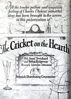 The Cricket on the Hearth is a 1923 American silent comedy film directed by Lorimer Johnston and starring Josef Swickard, Fritzi Ridgeway, and Paul Gerson.[1][2]