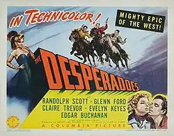 The Desperadoes is a 1943 American Western film directed by Charles Vidor and starring Randolph Scott, Claire Trevor, Glenn Ford, Evelyn Keyes and Edgar Buchanan.[2] Based on a story by Max Brand, the film is about a wanted outlaw who arrives in town to rob a bank that has already been held up. His past and his friendship with the sheriff land them both in trouble. The Desperadoes was the first Columbia Pictures production to be released in Technicolor.[3]