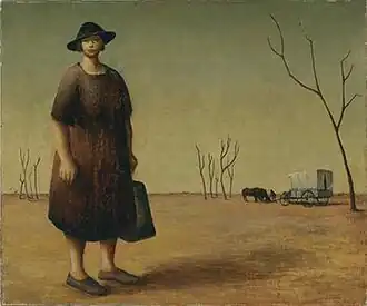 The Drover's Wife is an oil painting on canvas executed in 1945 by Australian artist Russell Drysdale. It depicts a flat, barren landscape with a woman in a plain dress in the foreground. The drover with his horses and wagon are in the background.[1] The painting has been described as "an allegory of the white Australian people's relationship with this ancient land."[1] Henry Lawson's 1892 short story "The Drover's Wife" is widely seen as an inspiration for the painting, although Drysdale denies that.[2]