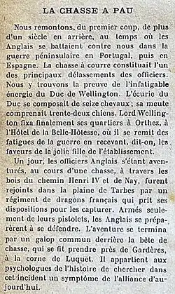 Firstly, we must go back a full century, when the English fought against us during the Peninsular War in Portugal. Fox-Hunting then was the chief diversion of the officers. The Duke of Wellington's stable consisted of 16 hunters; his pack was 32 hounds strong. The Duke's quarters were finally fixed at Orthez at the Belle Hôtesse inn, where he rested after the war and received, they say, the favors of the pretty girl of the establishment. One day, while the adventurous officers, in the course of a hunt, had crossed through Henry IV road and Nay, they were overtaken in the Tarbes plain by a detachment from a regiment of French dragoons, who, at once, took their positions to capture them. Armed solely with their pistols, the English prepared to defend themselves. The adventure ended with a collective gallop behind the fox who got himself caught near the village of Gardères, at the Luquet-Horn of the wood.[11][h]