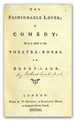 The Fashionable Lover is a comedy play by the British writer Richard Cumberland. It was first staged at the Drury Lane Theatre in London in January 1772.[1] The original Drury Lane cast included James William Dodd as Lord Aberville, Thomas King as Mortimer, Spranger Barry as Aubrey, Samuel Reddish as Tyrrel, Astley Bransby as Bridgemore, Robert Baddeley as Doctor Druid, Francis Godolphin Waldron as Napthali, John Burton as La Jeunesse, John Moody as Colin Macleod, Ann Street Barry as Augusta Aubrey and Elizabeth Hopkins as Mrs. Bridgemore.