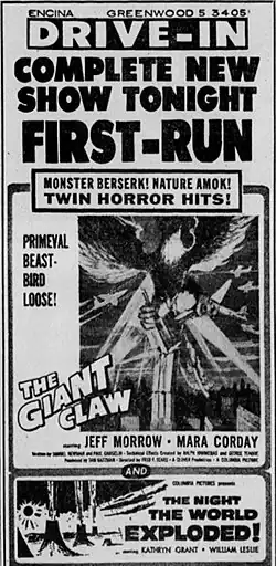 The Giant Claw is a 1957 American monster film from Columbia Pictures, produced by Sam Katzman, directed by Fred F. Sears, that stars Jeff Morrow and Mara Corday.[1] Both Sears and Katzman were well known as low-budget B film genre filmmakers.[2] The film was released as a double feature with The Night the World Exploded.