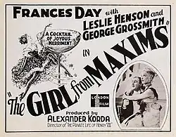 The Girl from Maxim's is a 1933 British musical comedy film directed by Alexander Korda and starring Frances Day, Leslie Henson, Lady Tree and Stanley Holloway.[1] It was an adaptation of the 1899 play La Dame de chez Maxim by Georges Feydeau.[2] A French-language version was filmed at the same time under the title La dame de chez Maxim's.
