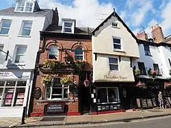 The south-western half of the building dates from the 19th century. It is brick-built and of two storeys, with a basement and attic. Internally, the building has been frequently altered and does not retain any original features.[2][1] Its ground floor, based around a corridor, is largely Victorian, but was partly redesigned in 1983, against the objections of the Campaign for Real Ale.[3]