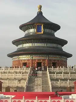 Carey regretted not visiting China before the script was written, as it caused problems during the filming of the village scenes in the Hubei province.[2][5] As they had imagined what a Chinese village would look like, it meant that they had to redress the actual village in which they filmed.[2] After discovering Tiananmen Square had been closed off for renovations, the crew were forced to film scenes in a side street.[2] Other locations used during filming included the Great Wall of China and the Forbidden City.[3] Chinese extras were also employed during the shoot.[5] While filming the final scene of the episode, Carey laid down on a stone carving at the Temple of Heaven, causing the Chinese police to halt the shoot and issue him with a fine.[5] Of the situation, Cohen commented "I guess the system is different. We thought, 'OK, we had a permit for this, we are ready for this, we are going to be here on a certain day at a certain time and everybody knows, right?'"[5] The majority of the scene had already been filmed and Carey was not made to pay the fine.[5] The finale is an imitation of Rocky Balboa's (Sylvester Stallone) run up the steps of the Philadelphia Museum of Art in Rocky.[2]