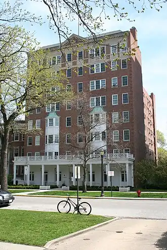 The Homestead is a historic apartment hotel at 1625 Hinman Avenue in Evanston, Illinois. Opened in 1928, it was one of several apartment hotels built in Evanston in the 1920s. Popular in the early twentieth century, apartment hotels housed a mixture of short-term and long-term guests; they were frequently used by workers who did not wish or could not afford to live near their workplace full-time. Architect Philip Arthur Danielson designed the building in the Colonial Revival style, which was used on many other apartments from the era in Evanston. The design includes a verandah supported by Doric columns along the front facade, two projecting three-bay windows, brick quoins, and a dentillated cornice with a pediment.[2]