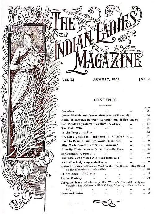 The Indian Ladies' Magazine, established by Kamala Satthianadhan in 1901 in Madras, was the first English-language Indian women's magazine created and edited by a woman.[1] Kamala Satthianadhan was encouraged by her husband, Dr. Samuel Satthianadhan, a prominent educationist and reformer, to start a journal for women at the dawn of the twentieth century.[2]61
