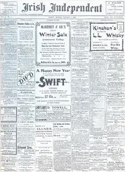 The Irish Independent was formed in 1905 as the direct successor to The Irish Daily Independent and Daily Nation, an 1890s' pro-Parnellite newspaper. It was launched by William Martin Murphy, a controversial Irish nationalist businessman, staunch anti-Parnellite and fellow townsman of Parnell's most venomous opponent, Timothy Michael Healy from Bantry.[4] The first issue of the Irish Independent, published 2 January 1905, was marked as "Vol. 14. No. 1".