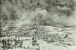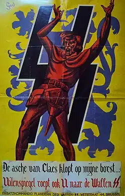 In the 1940s Ray Goossens made a gag-a-day comic about Uilenspiegel and Lamme Goedzak.[2] Willy Vandersteen drew two comic book albums about Uilenspiegel, "De Opstand der Geuzen" ("The Rebellion of the Geuzen") and "Fort Oranje" ("Fort Orange"), both drawn in a realistic, serious style and pre-published in the Belgian comics magazine Tintin between 1952 and 1954. They were published in comic book album format in 1954 and 1955. The stories were drawn in a realistic style and in some instances followed the original novel very closely, but sometimes followed his own imagination more.[3] Dutch comics artist George van Raemdonck adapted the novel into a comic strip in 1964.[4]