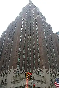 The original architect was Schultze & Weaver, whose first major commission had been the Millennium Biltmore in Los Angeles.[7] The hotel was designed in the Romanesque Revival style, with a facade of brick, limestone, and architectural terracotta. The hotel building contains setbacks to comply with the 1916 Zoning Resolution.[8] It is variously cited as being 25,[9] 27,[8] or 30 stories high.[10] This discrepancy is based on whether the towers atop the building, which have pyramidal roofs, are counted.[8]