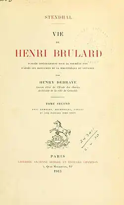 The Life of Henry Brulard (French: Vie de Henri Brulard) is an unfinished autobiography by Stendhal. It was begun on November 23, 1835, and abandoned March 26, 1836, while the author was serving as the French Consul in Civitavecchia. Stendhal had severe doubts about contemporary interest in his autobiography, so he bequeathed it to the reader of 1880, or of 1935, or 2000. The manuscript, including Stendhal's numerous diagrams and illustrations, was published in 1890. Stendhal primarily discusses his unhappy and dull childhood, touching briefly on his time as a soldier. The Life of Henry Brulard is considered a masterpiece of autobiographical writing and ironic self-reflection.[1][2]