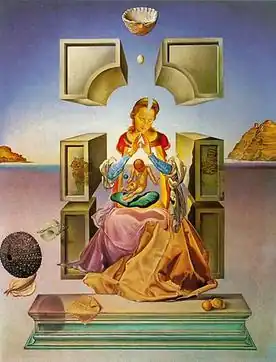 The Madonna of Port Lligat is a pair of paintings by Salvador Dalí. The first was created in 1949, measuring 49 x 37.5 centimetres (19.3 x 14.8 in), and is housed in the Haggerty Museum of Art at Marquette University in Milwaukee, Wisconsin, USA. Dalí presented it to Pope Pius XII in an audience for approval, which was granted. Dalí created a second painting in 1950 with the same title and same themes, with various poses and details changed, measuring 275.3 x 209.8 centimetres (108.4 x 82.6 in). The 1950 Madonna is exhibited at the Fukuoka Art Museum in Japan.[1]