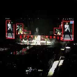 Warren Carlyle was signed as the creative director for the show, while Ashley Wallen choreographed the dancers through intricate dance steps.[20] The large main stage was elevated and set up at the end of the arenas, with a long runway extending from its middle, the pathway ended into a round-shaped front.[21] The tour featured costumes from Tom Ford including, a black snake-print velvet jacket, a metallic silver jacket and an ensemble of white shirt with pleated bib, silk-satin cummerbund and black fedora.[22][23][24][25][26]