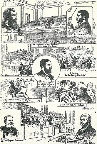 The premiere of The Martyr of Antioch took place on 15 October 1880 at Leeds Town Hall, employing impressive forces: The orchestra numbered 111 instrumentalists, and there were 306 choristers.[11] The audience numbered more than 2,000 including Sullivan's mother and his friend, Alfred, Duke of Edinburgh, who was President of the festival. The oratorio formed the first half of the programme that morning, followed by a performance of Beethoven's Mass in C and Schubert's Song of Miriam in the second half.[12] The Leeds Mercury's reviewer wrote: